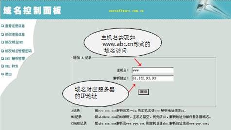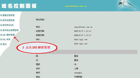 域名申請(qǐng)成功之后首先需要做域名解析 下面是解析域名方法,以中國(guó)數(shù)據(jù)網(wǎng)為例,首先登錄域名解析控制面板,進(jìn)入域名控制面板中,可以看到左邊的DNS解析管理。