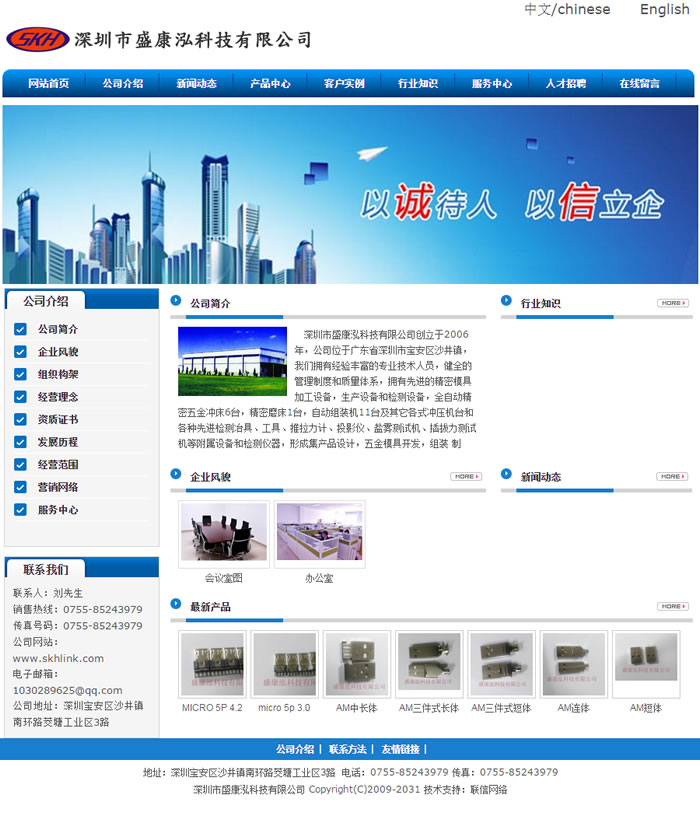 深圳市盛康泓科技有限公司創立于2006年,公司位于廣東省深圳市寶安區沙井鎮,我們擁有經驗豐富的專業技術人員,健全的管理制度和質量體系,擁有先進的精密模具加工設備,生產設備和檢測設備,全自動精密五金沖床6臺,精密磨床1臺,自動組裝機11臺及其它各式沖壓機臺和各種先進檢測冶具、工具、推拉力計、投影儀、鹽霧測試機、插拔力測試機等附屬設備和檢測儀器,形成集產品設計,五金模具開發,組裝 制造,售后服務一體化之經營體系,能快速開發制作各種類型的精密五金模具及高精密小間距連接器。 主要生產研發項目有:USB 公頭系列、USB母座系列、MINIUSB系列、MICROUSB系列,產品廣泛用于家用電器、手機充電器、排插、辦公設備、計算機設備等。 公司工藝先進,具備可靠的檢測儀器;良好的員工素質;穩定的生產能力;品種齊全,性能安全可靠,服務好,價格合理。產品銷售遍布國內及國外市場,在同行業競爭中脫穎而出,不斷成長與壯大。