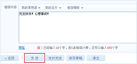 在短信內(nèi)容文本框輸入短信內(nèi)容,可根據(jù)實(shí)際需要插入常用語、名片以及短信模板,系統(tǒng)會(huì)自動(dòng)計(jì)算出輸入的字?jǐn)?shù)、預(yù)計(jì)計(jì)費(fèi)條數(shù)、剩余輸入的短信字?jǐn)?shù)供用戶參考。